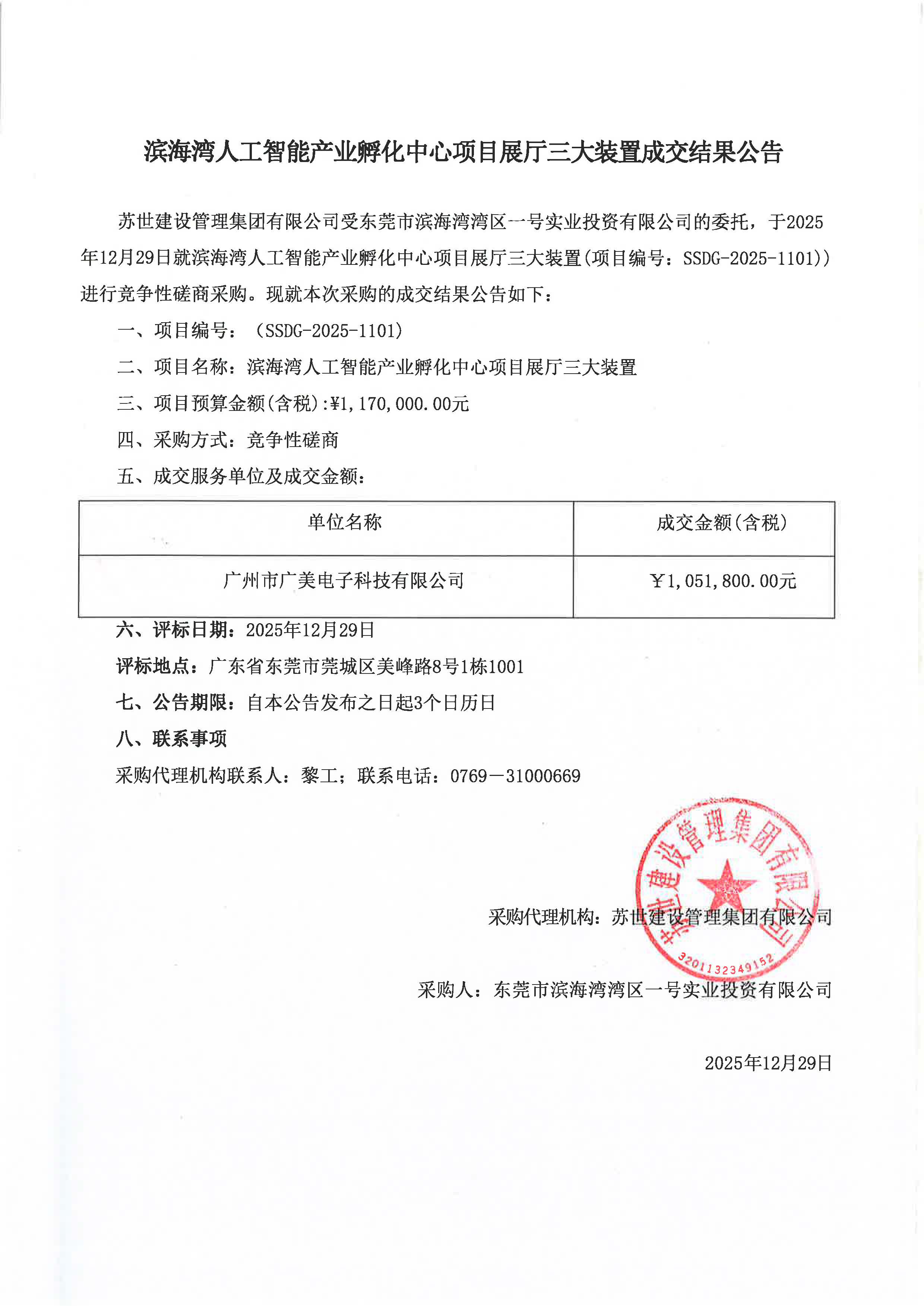 滨海湾人工智能产业孵化中心项目展厅三大装置成交结果公告