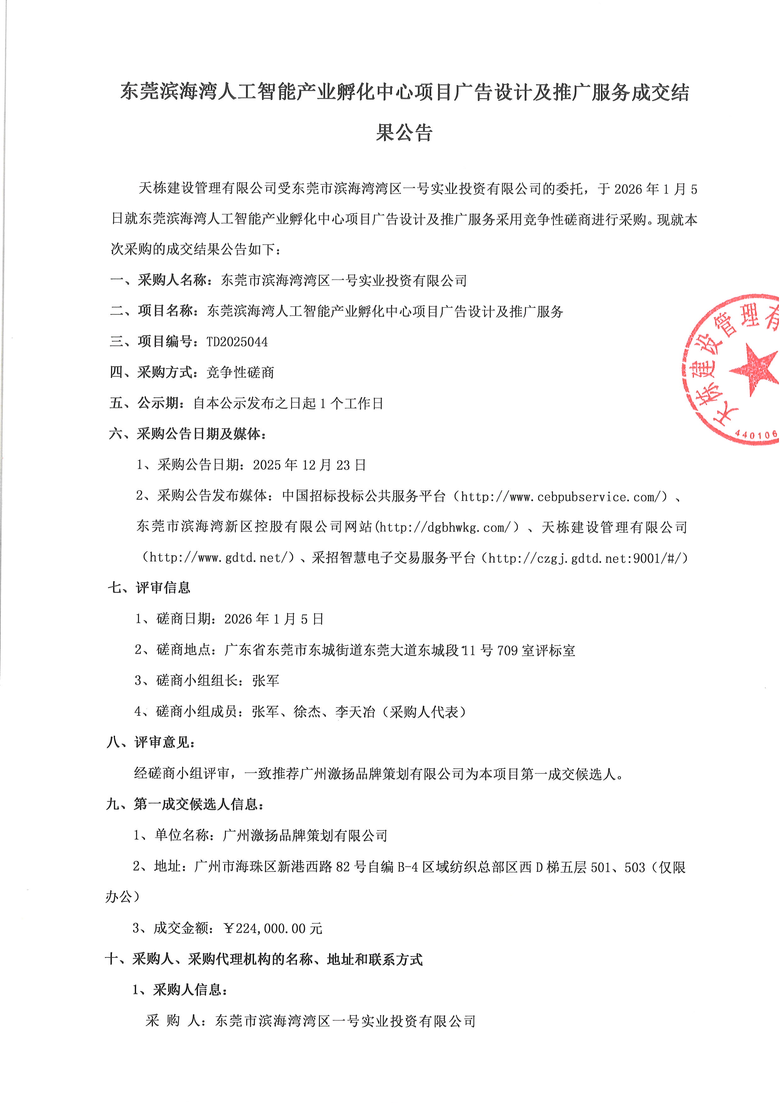 东莞滨海湾人工智能产业孵化中心项目广告设计及推广服务成交结果公告