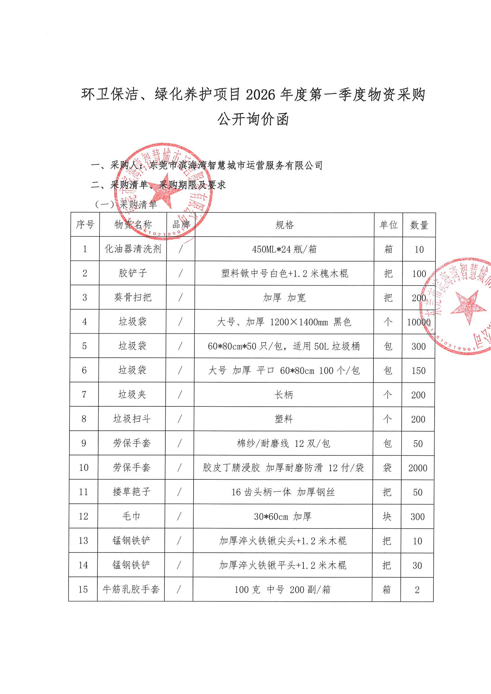 环卫保洁、绿化养护项目2026年度第一季度物资采购公开询价函