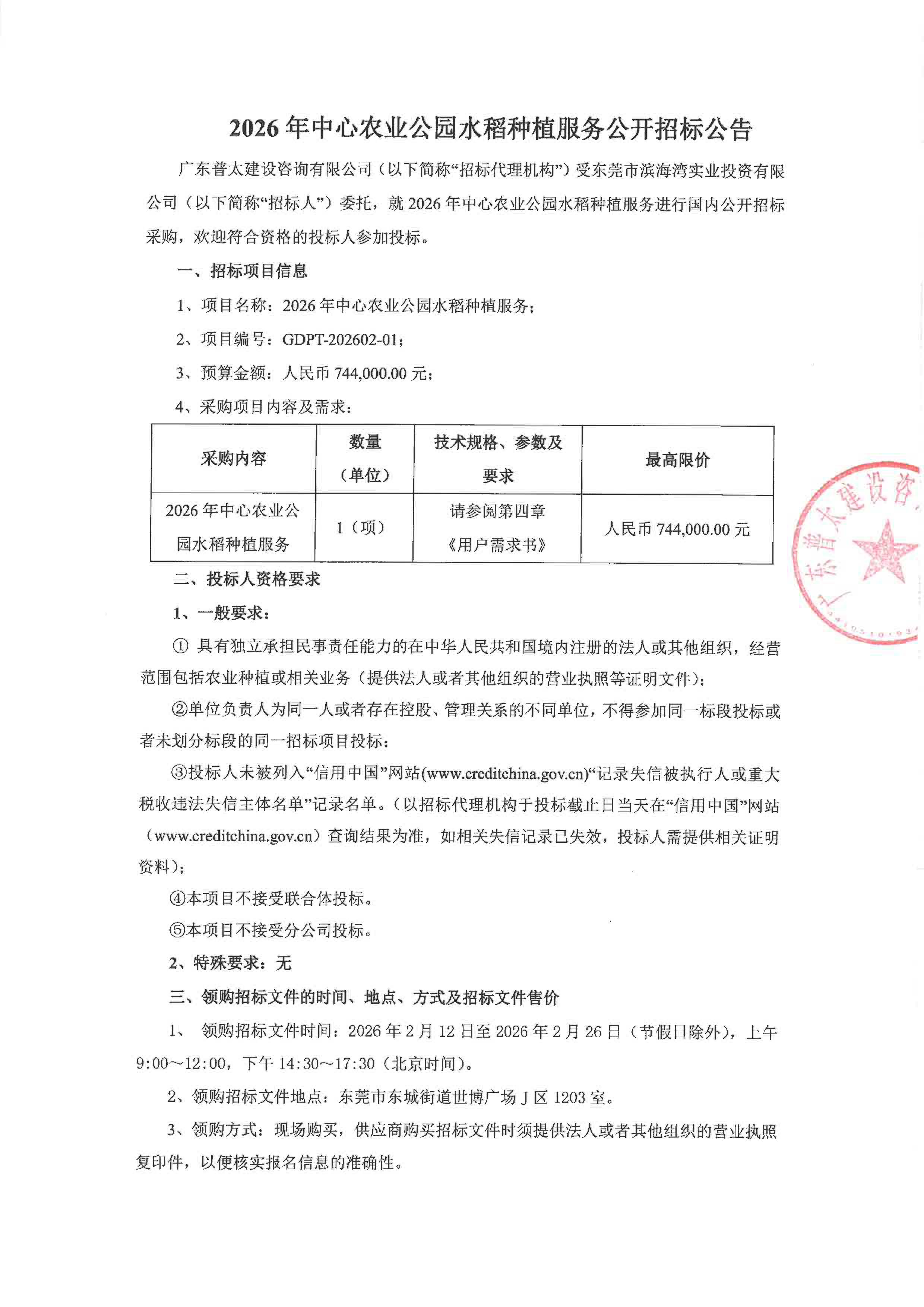 2026年中心农业公园水稻种植服务公开招标公告