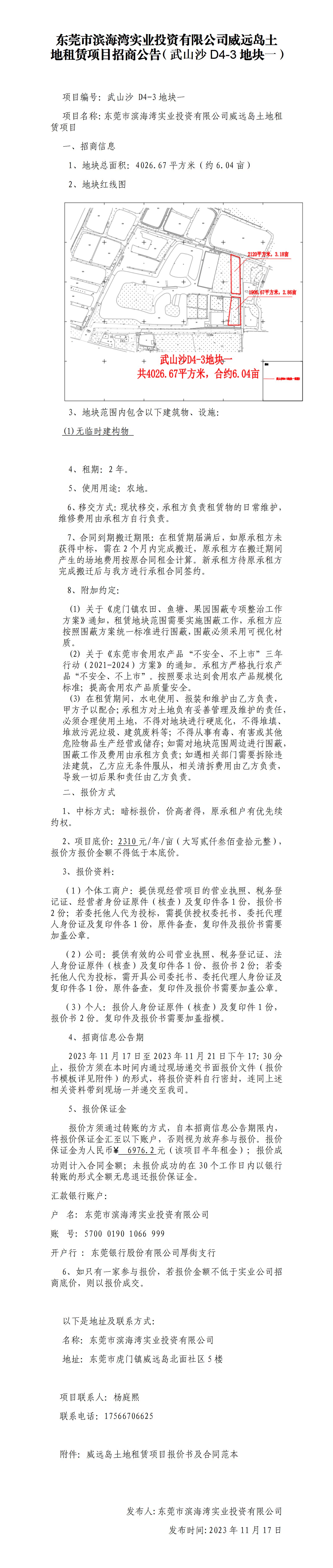 东莞市滨海湾实业投资有限公司威远岛土地租赁项目招商公告(武山沙D4-3地块一)
