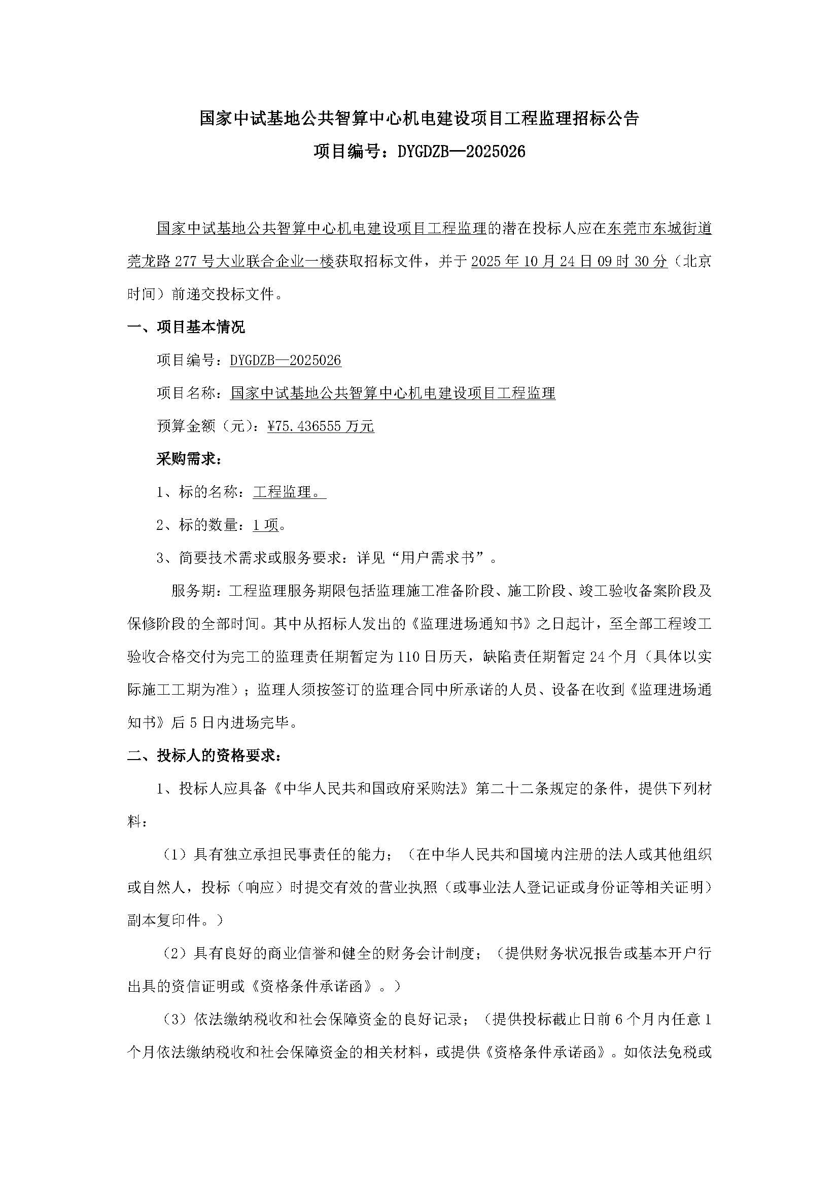 国家中试基地公共智算中心机电建设项目工程监理招标公告