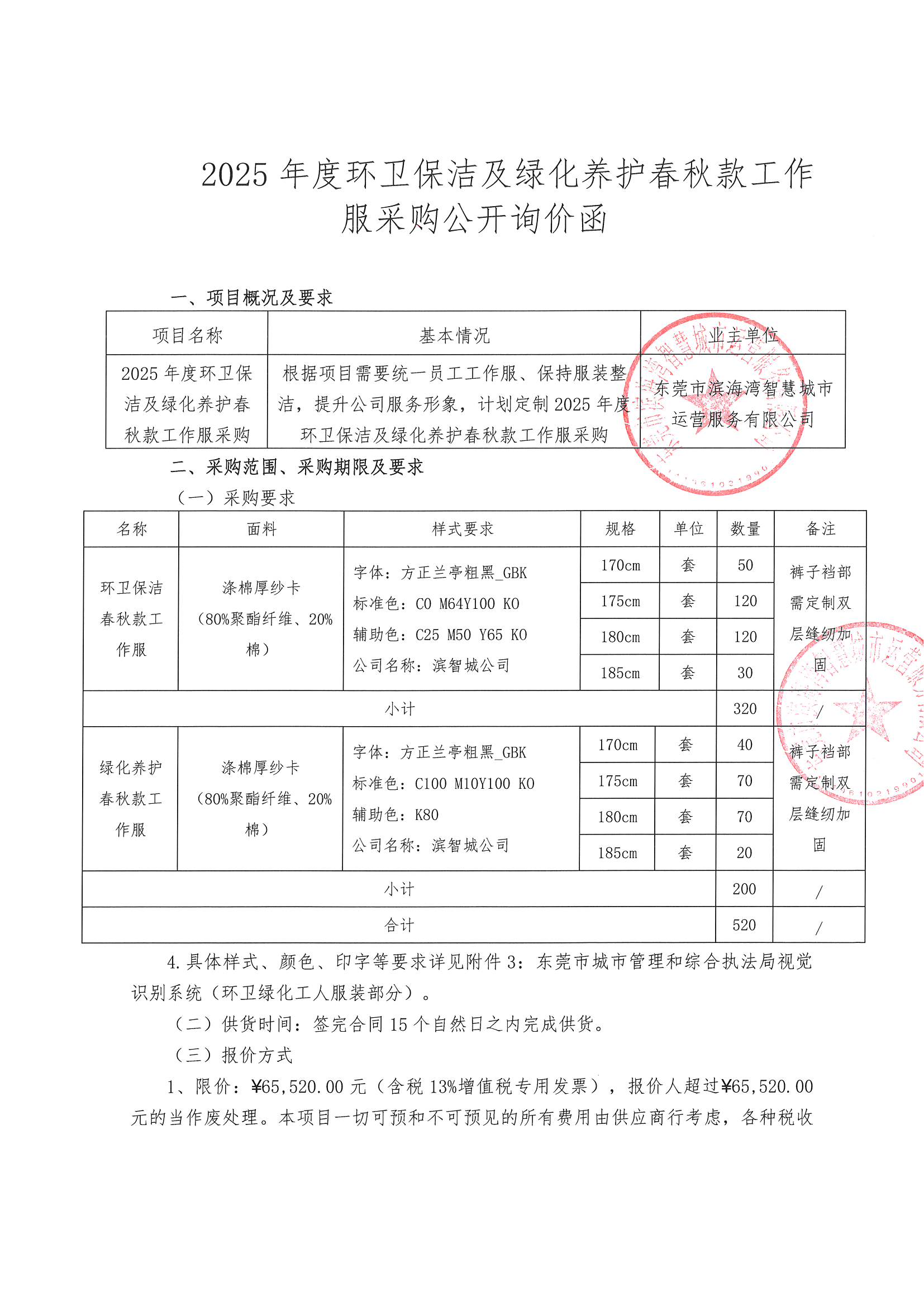 2025 年度环卫保洁及绿化养护春秋款工作服采购公开询价函