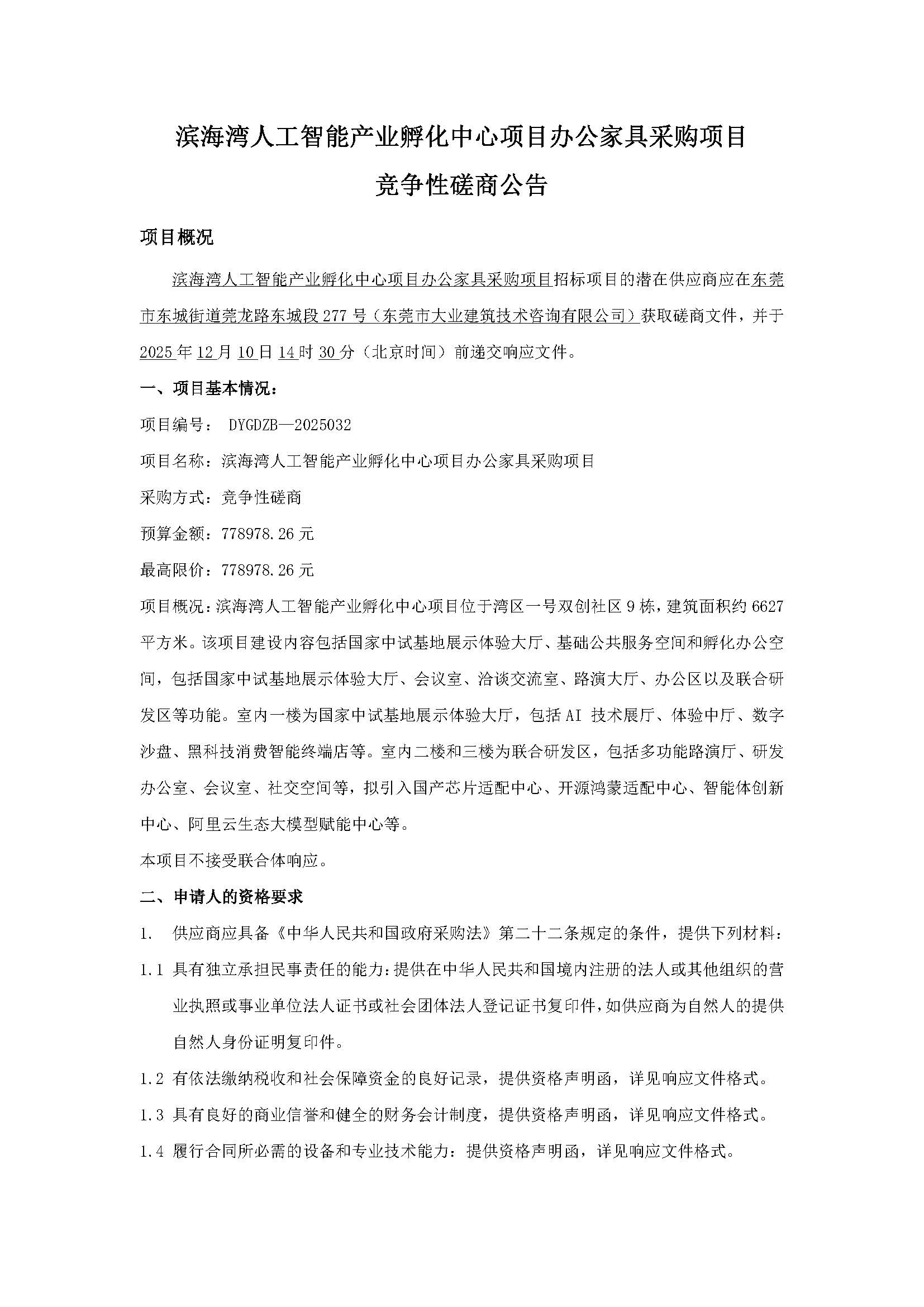 滨海湾人工智能产业孵化中心项目办公家具采购项目竞争性磋商公告