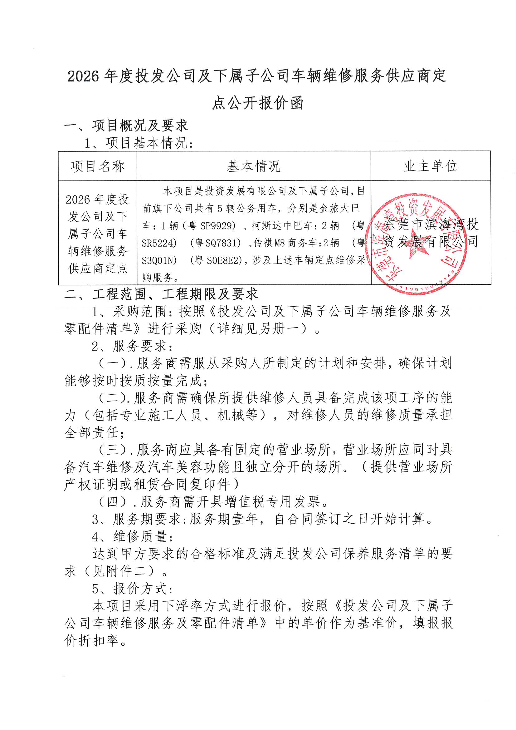 2026年度投发公司及下属子公司车辆维修服务供应商定点公开报价函附件一