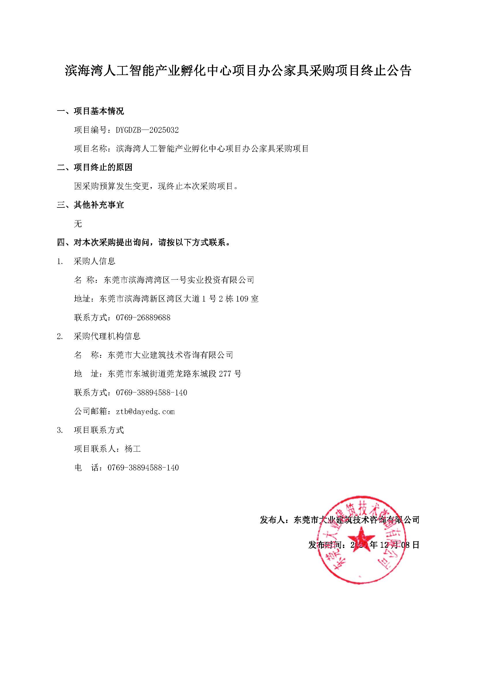滨海湾人工智能产业孵化中心项目办公家具采购项目终止公告