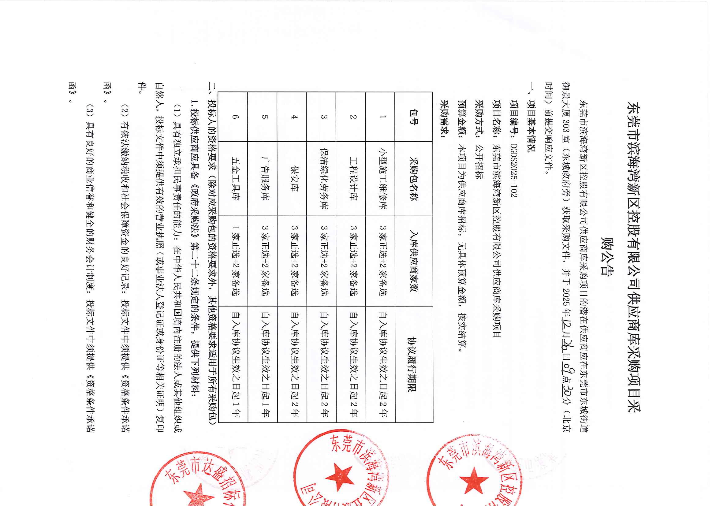 东莞市滨海湾新区控股有限公司供应商库采购项目采购公告