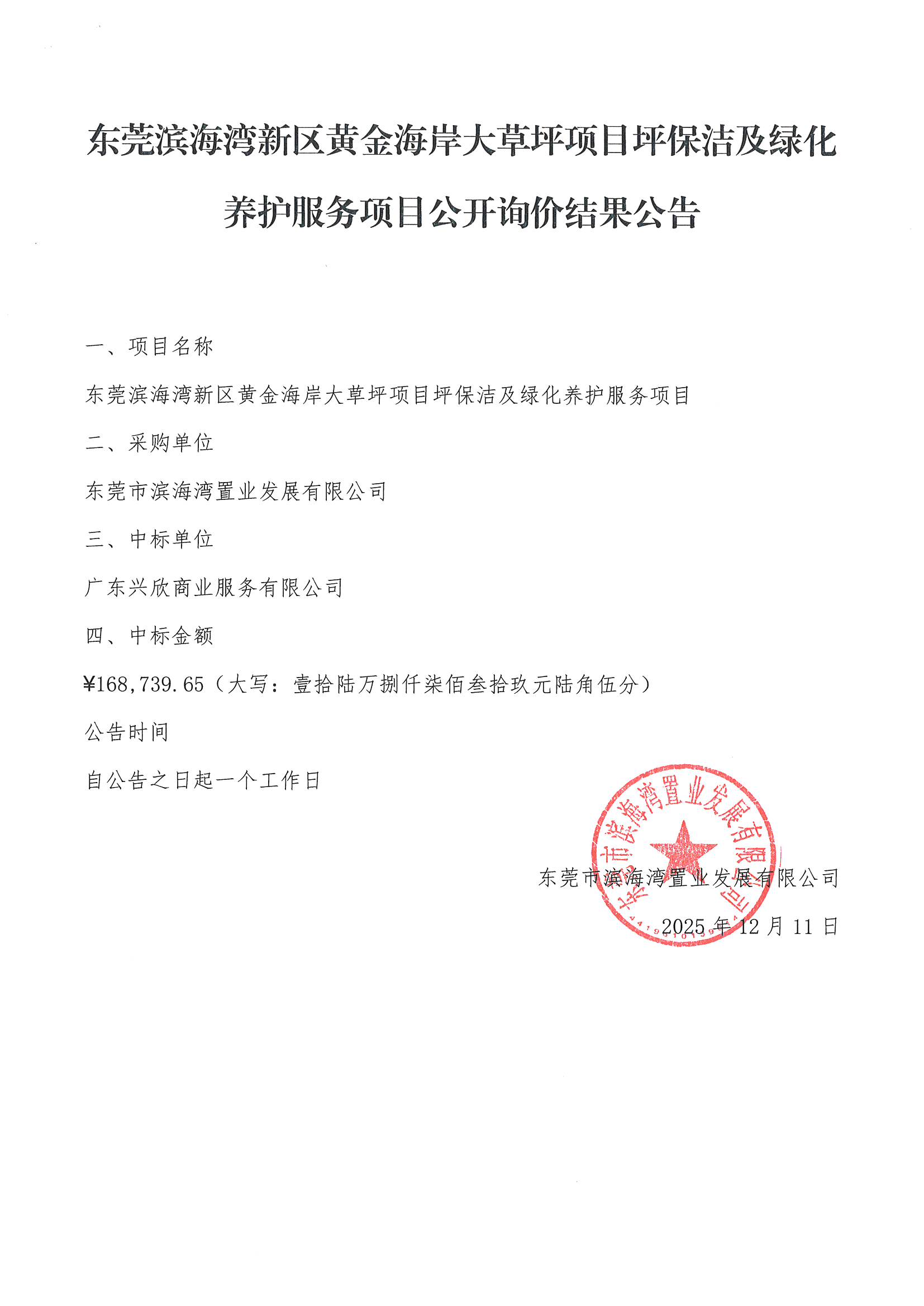东莞滨海湾新区黄金海岸大草坪项目坪保洁及绿化养护服务项目公开询价结果公告