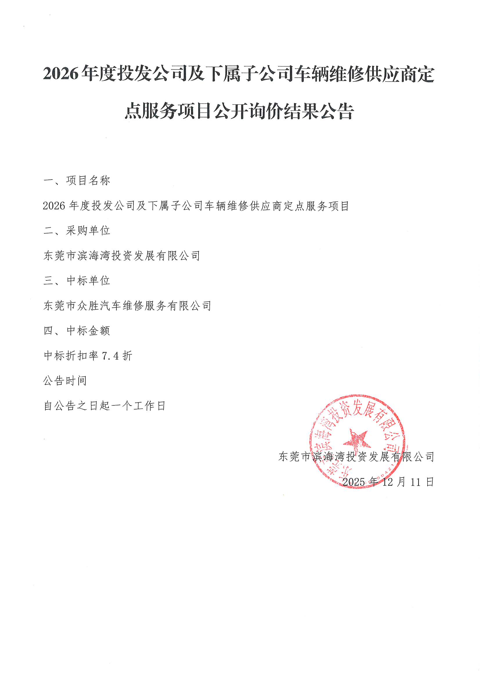 2026年度投发公司及下属子公司车辆维修供应商定点服务项目公开询价结果公告