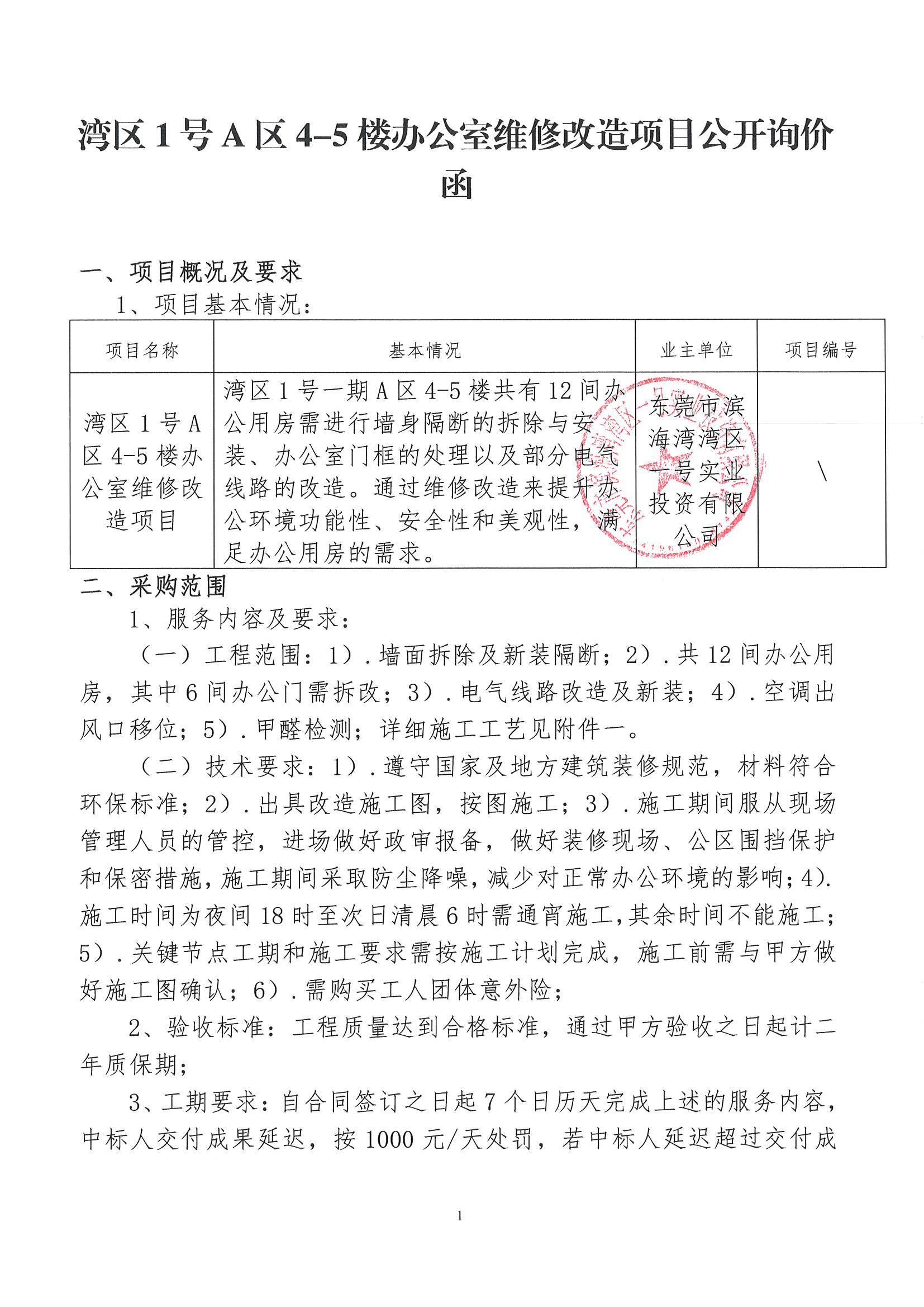 附件一、湾区1号A区4-5楼办公室维修改造项目公开询价函