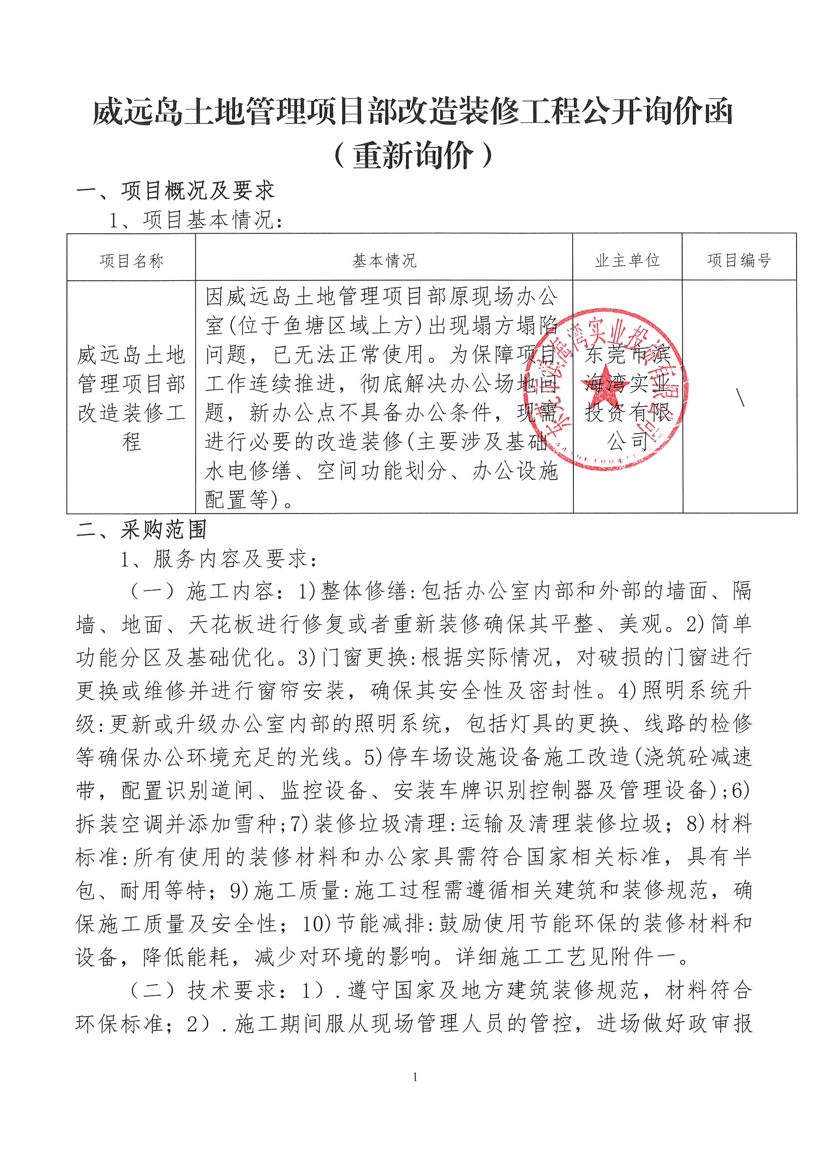 附件一:威远岛土地管理项目部改造装修工程报价文件【重新询价】