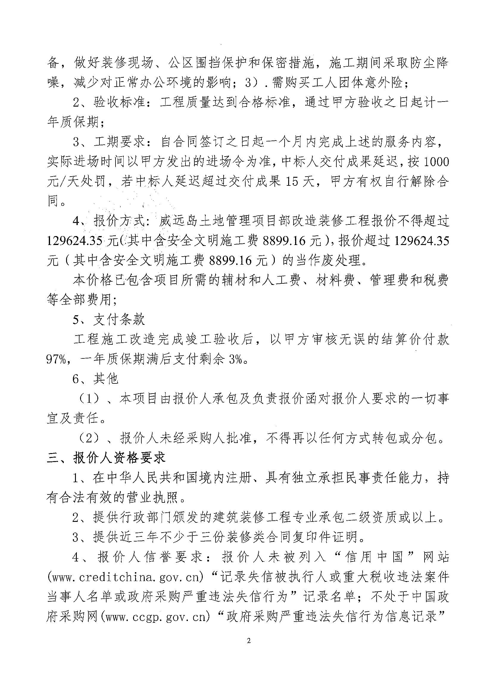 威远岛士地管理项目部改造装修工程公开询价函(重新询价)