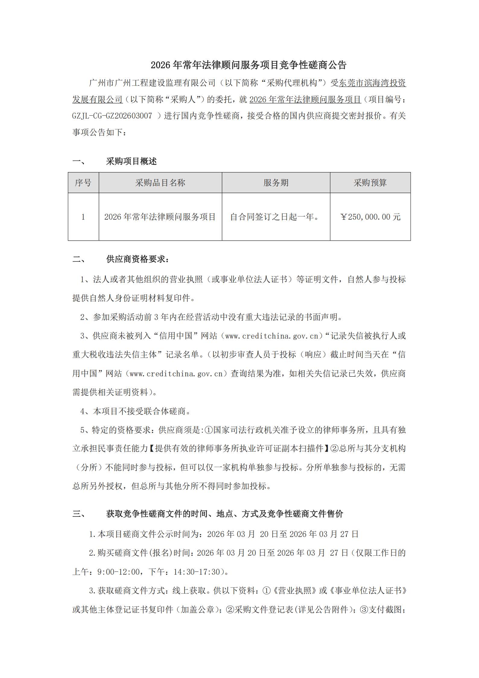 2026年常年法律顾问服务项目竞争性磋商公告