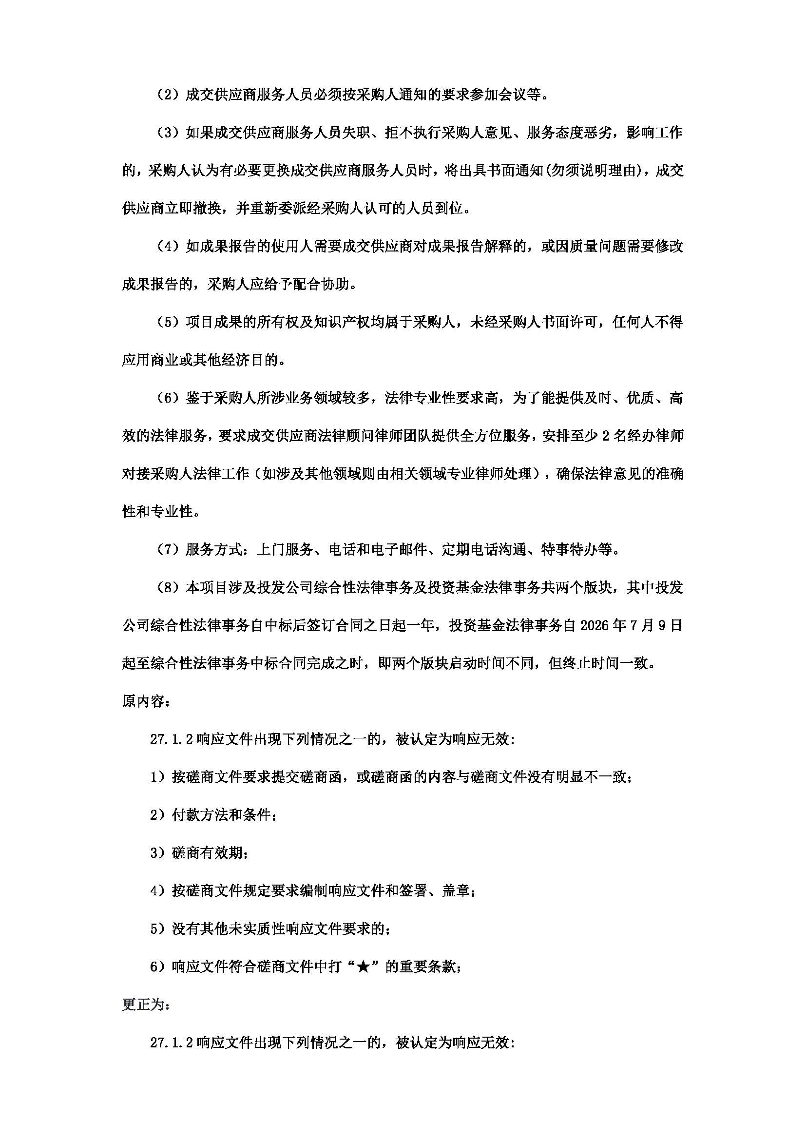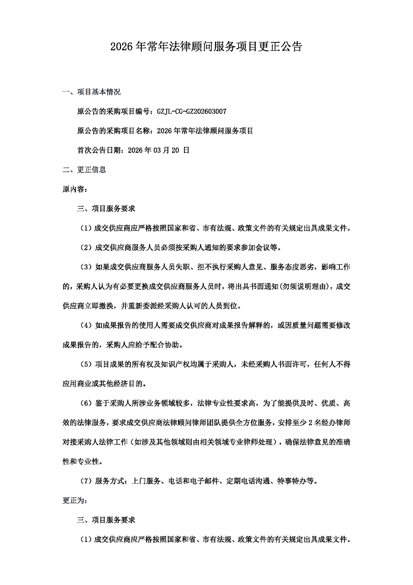 2026年常年法律顾问服务项目更正公告