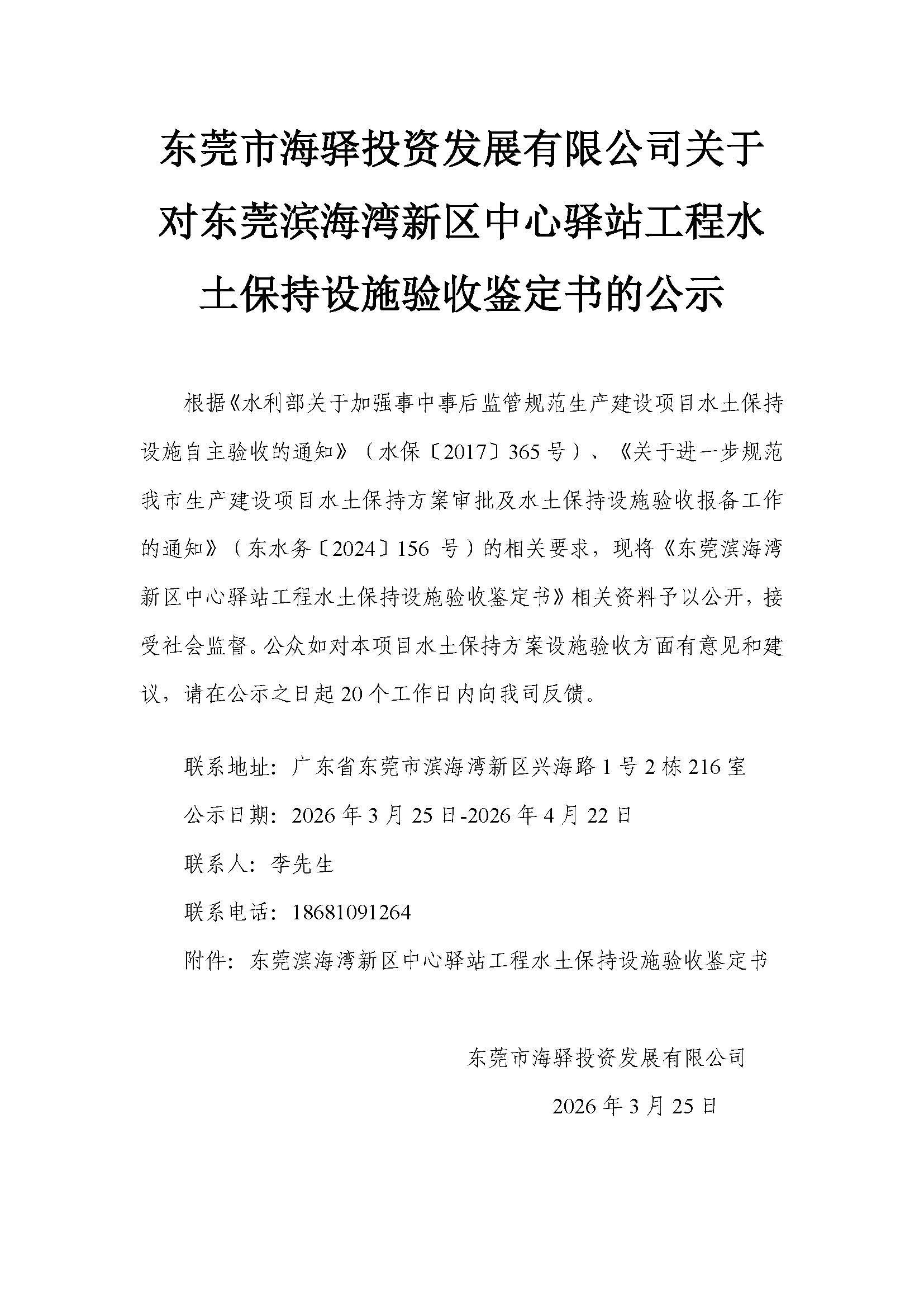 东莞市海驿投资发展有限公司关于对东莞滨海湾新区中心驿站工程水土保持设施验收鉴定书的公示
