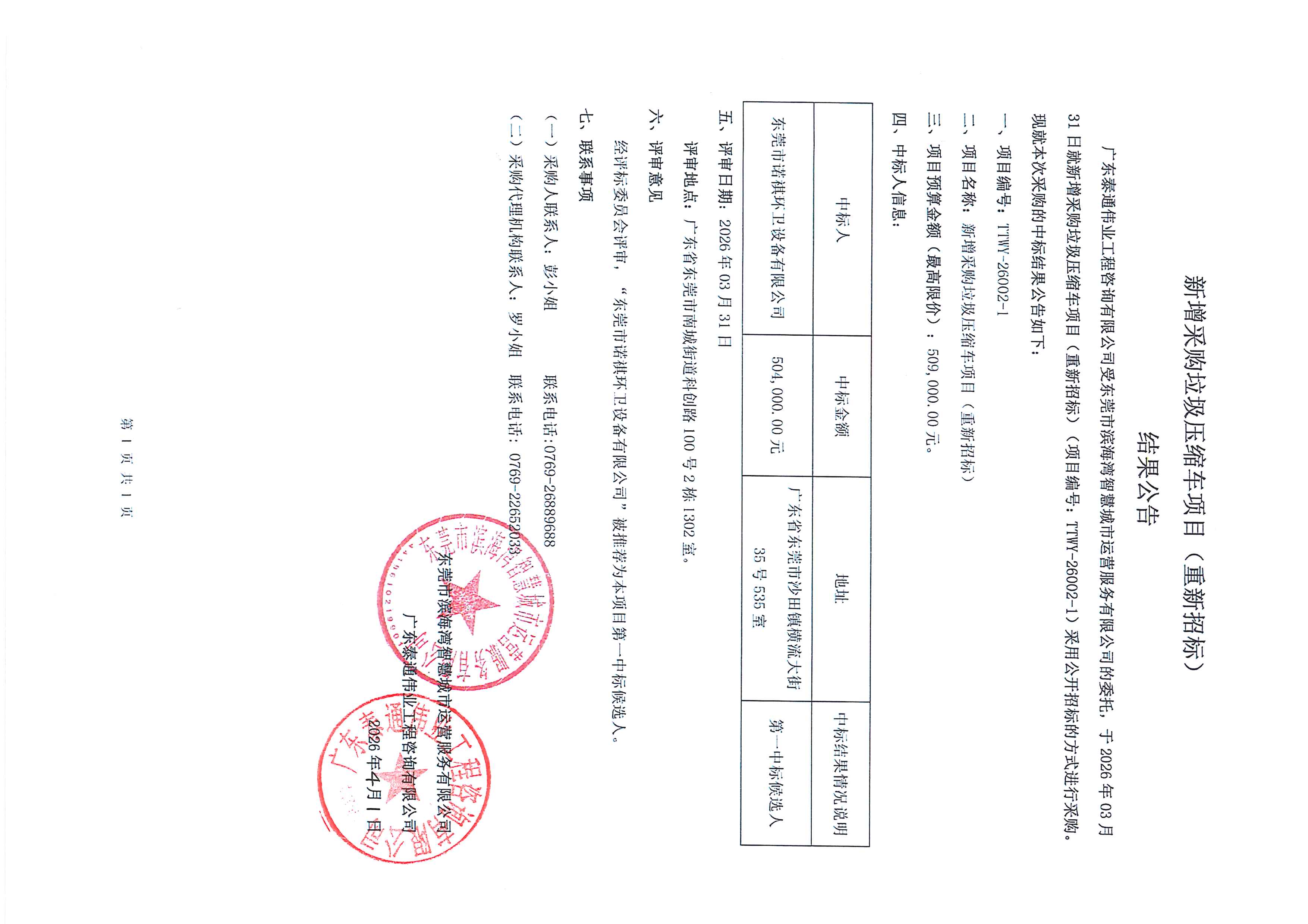 新增采购垃圾压缩车项目(重新招标)结果公告